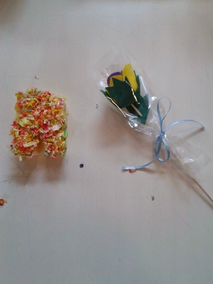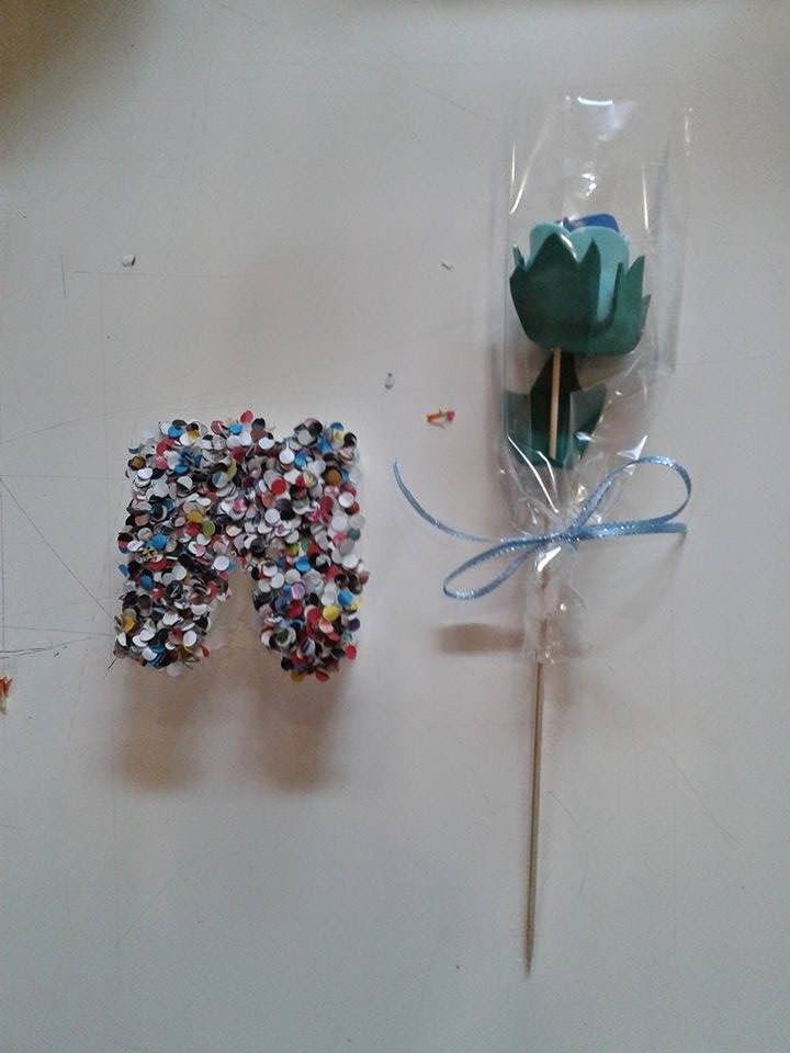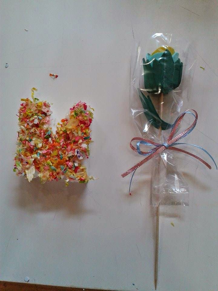 Dia 18 - "DESCOBRE O MEU NOME" - Um carimbo com as letras do alfabeto, ou seja a inicial do nosso nome, feito com esponja de banho e decorada com papelinhos coloridos. Como houve tempo ainda fizemos uma rosa em Eva para oferecer á mãe.